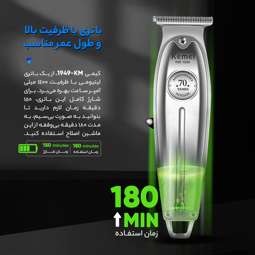 ماشین اصلاح موی صورت کیمی km 1949 ماشین اصلاح موی Kemei KM 1949 یکی از بهترین و پرفروشترین ریشتراشهای مردانه در بازار است. این ماشین اصلاح مو با طراحی منحصر به فرد و کارایی بینظیر خود، توانسته است جایگاه ویژهای در میان محصولات مشابه داشته باشد. با استفاده از تکنولوژی پیشرفته و تیغههای تیز و دقیق، این ریشتراش به راحتی و به صورت حرفهای موهای زائد صورت را اصلاح کرده و به شما ظاهری زیبا و مرتب بخشیده است. در ضمن، ماشین اصلاح موی Kemei KM 1949 دارای قیمت مناسبی هم است که با کیفیت بالا و عملکرد قابل اعتماد خود، ارزش بیشتری به خریداران خود ارائه میدهد. با استفاده از این ریشتراش، مردان میتوانند به سادگی و با اطمینان بالا، به بهترین شکل ممکن از ظاهر خود مراقبت کنند و به زیبایی و زیرکی خود بیفزایند. تکنولوژی تیتانیوم هم در ریشترشهای برقی بسیار محبوب است. این تکنولوژی به دلیل مقاومت بالا در برابر خوردگی و سایش، بسیار پرکاربرد است. مزایای این تکنولوژی شامل عمر طولانی، سرعت بالا و اصلاح دقیق است. تکنولوژی کربن فایبر هم در ریشترشهای برقی استفاده میشود. این تکنولوژی به دلیل سبکی و مقاومت بالا در برابر خوردگی مورد توجه قرار گرفته است. از مزایای این تکنولوژی میتوان به اصلاح سریع، کارایی بالا و دوام بالا اشاره کرد. مهمترین ویژگیهای ماشین اصلاح کابردی و استاندارد این ماشین اصلاح با طراحی خاص و جذاب خود، به کاربر امکان میدهد تا با راحتی بیشتری از آن استفاده کند و از دقت بیشتری در حالتدهی موهای خود برخوردار شود. طراحی زیبا این دستگاه، نشاندهنده دقت و توجه سازندگان آن به جزئیات است که باعث افزایش کارایی و کاربردی بودن آن میشود. علاوه بر این، ماشین اصلاح مذکور دارای تنظیمهای مختلفی برای طول مو است که به کاربر امکان میدهد تا طول موهای خود را با دقت و صحیحترین شکل ممکن تنظیم کند. این امکانات تنظیمی، به کاربر انعطاف بیشتری در انتخاب طول مو و در نتیجه داشتن حالت موی دلخواه خود را میدهد.