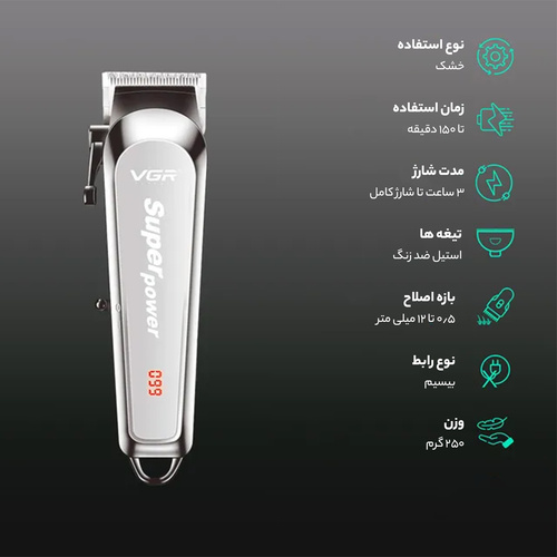 ماشین اصلاح برند وی جی ار VGR مدل V-060 قدرتمند با تکنولوژی اصلاح بصورت برش مستقیم با تیغه هایی از جنس تیتانیوم عرضه شده است که شما میتوانید در سالن و استفاده شخصی از ان بهرمند شوید اندازه تیغه ثابت و متحرک این ماشین اصلاح به وسیله اهرم تنظیم اصلاح از سایز 0/8 میلی متر تا 2/0 میلی متر تنظیم می شود همچنین دارای چهار عدد شانه اصلاح در چهار سایز 3 میلی متر .6 میلیمتر . 9 میلیمتر .و 12 میلیمتر میباشد که در مرزبندی بالاتر می توان به وسیله ان اصلاح انجام داد. طراحی این ماشین اصلاح بصورت ارگونومیک می باشد منبع تغذیه برق مستقیم شهری و باتری قابل شارژ می باشد. که شارژ کامل ان 2 ساعت زمان نیاز دارد و قابلیت استفاده تا 90 دقیقه کار را دارد این ماشین اصلاح دیجیتالی می باشد دارای نمایشگر LCD می باشد