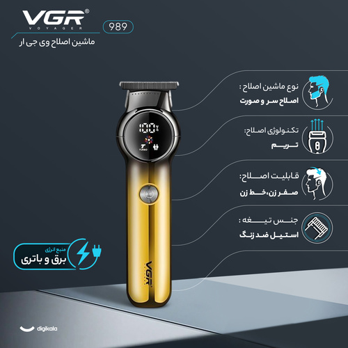 ماشین اصلاح موی سر و صورت شارژی وی جی ار مدل 989، اصلاح به صورت خط زن و صفر زن، منبع انرژی با برق و باتری، تکنولوژی اصلاح به صور
