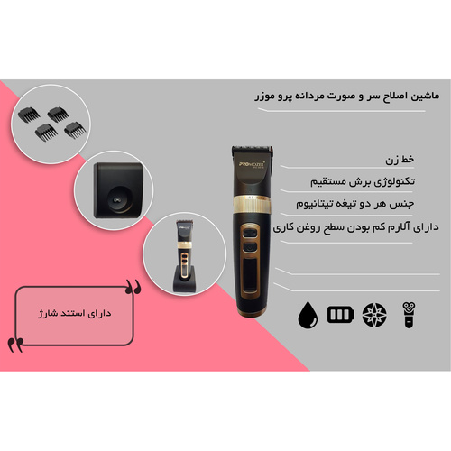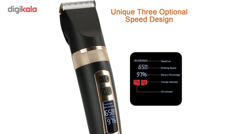 سایر مشخصات- دارای آلارم کم بودن سطح روغن کاری- دارای آلارم کمبود شارژ- قابلیت افزایش و کاهش قدرت موتور- قابلیت تنظیم اندازه اصلاح- جنس هر دو تیغه تیتانیوم - دارای LCD- دارای استند شارژ- طراحی ظریف و خوش دست