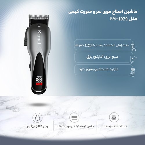 ماشین اصلاح حرفهای کیمی kemei KM-1929 تمام آقایان به دنبال خرید ماشین اصلاحی هستند که دارای استحکام و ماندگاری بالایی باشد. بدون شک ماشین اصلاح کیمی مدل KM-1929 یکی از همین گزینه هاست زیرا دستگاههای تولیدی شرکت Kemei استحکام، ماندگاری و قدرت موتور بسیار بالایی دارند. این ماشین اصلاح دارای سری «برش مستقیم» است که به کوتاهکردن موهای سر و صورت با مرزبندی مشخص کمک میکند. این دستگاه تیغهای از جنس استیل ضدزنگ دارد که به مقاومت آن در هوای مرطوب میافزاید. با استفاده از سری آن میتوان موهای صورت را در اندازهی بسیار کوتاه (تهریش) اصلاح کرد؛ یعنی در اندازهی 0.1 تا 3 میلیمتر. اندازههای اصلاح با استفاده از اهرم کنار آن در هشت حالت انجام میشود. است. یکی از نکات مهم این دستگاه، سرعت موتور آن است که 6000 دور در دقیقه میچرخد. این ویژگی موجب سریعتر کوتاهکردن موهای صورت میشود. از اقلام همراه این دستگاه میتوان به چهار شانهی آن اشاره کرد. داخل جعبهی دستگاه علاوه بر شانهها، برس تمیزکننده و روغن نیز قرار دارد. حرکت تیغهها روی یکدیگر میتواند باعث کندشدنشان شود؛ بنابراین برای حفظ کارایی ماشین اصلاح، لازم است بعد از چند بار استفاده، تیغهها تمیز شده و سپس روغنکاری شوند. این کار در مرتبهی اول و قبل از اینکه کالا به دست شما برسد، توسط کارخانه انجام میشود؛ درنتیجه ممکن است با بازکردن جعبه در اولین مرتبه، آثار آن را مشاهده کنید. خصوصیات کلی: ماشین اصلاحی مناسب آرایشگرهای حرفه ای مناسب کار و استفاده متوالی دارای صفحه نماشگر دیجیتالی بدنه زیبا ، شکیل و خوش رنگ بی سیم و قابلیت حمل آسان تغذیه از باتری قابل شارژ ظرفیت و نوع باتری : 2000mAh Lithium-ion battery ولتاژ ورودی : 110 - 240V فرکانس : 50 / 60Hz زمان پر شدن باتری : 90 دقیقه (پشتیبانی از شارژ سریع) زمان آماده به کار : 210دقیقه