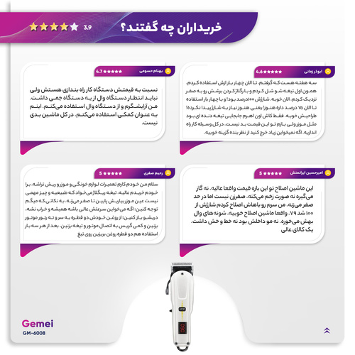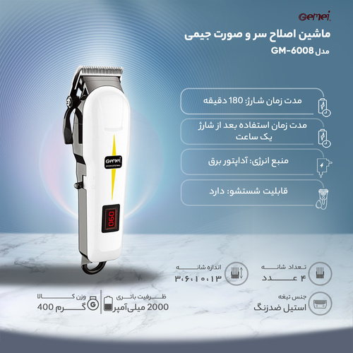 ماشین اصلاح سر و صورت جیمی مدل GM-6008، یک ماشین اصلاح حرفهای مخصوص آقایان بوده که برای اصلاح سر و صورت مناسب است و یک گزینه عالی برای کسانی است که به دنبال ماشین اصلاح پر قدرت با قابلیت تنظیم درجه اصلاح هستند. این ماشین اصلاح دارای کیفیت و جنس بدنه عالی بوده به رنگ سفید براق همراه با تیغههای استیل ضد زنگ موجود است. تیغههای دستگاه از استیل ضد زنگ هستند و حساسیت ایجاد نمیکنند. این دستگاه دارای چهار شانه است که با توجه به انتخاب شما تغییر میکند. سایز شانهها 3، 6، 10 و 13 است که به همراه محصول ارسال خواهند شد. به وسیله اهرم قابل تنظیمی که در سمت چپ دستگاه تعبیه شده است، میتوان سایز اصلاح را به صورت دستی تنظیم کرد و استفاده از 4 شانه کمکی که همراه این دستگاه قرار داده شده است، کار را بیش از پیش راحت میکند. این ماشین اصلاح با دارا بودن بدنه ارگونومیک و خوشدست، مناسب استفاده طولانی است؛ به گونهای که اصلا احساس خستگی به شما القا نخواهد کرد. منبع تغذیه این ماشین اصلاح از آداپتور برقی است که در بستهبندی این محصول قرار دارد و میتوان هم با شارژ و هم با برق مستقیم از آن استفاده کرد. مدت زمان شارژ کامل باتری در این ابزار، 180 دقیقه و زمان شارژدهی آن 1 ساعت است. همراه با محصول، برس تمیز کننده وجود دارد؛ برای افزایش طول عمر تیغهها توصیه میشود بعد از استفاده از ماشین اصلاح آنها را با برس تمیز کنید.