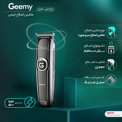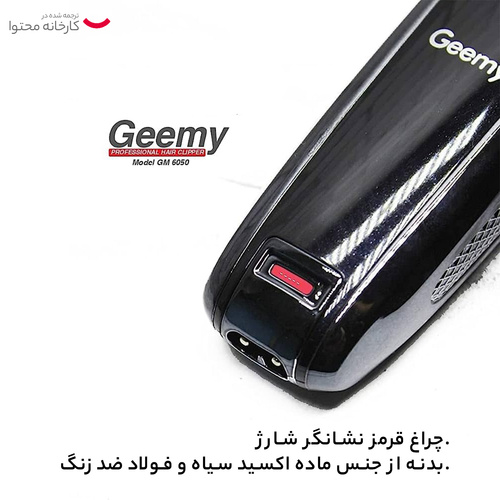 ماشین اصلاح موی سر و صورت جیمی مدل GM-6050، نمایشگر وضعیت باتری، منبع انرژی با برق، تکنولوژی اصلاح به صورت برش مستقیم، اندازه اص