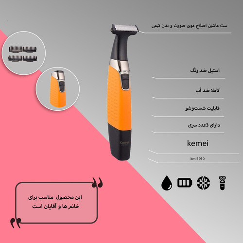 استفاده از ماشین اصلاحی که بتواند موهای بدن را زیر دوش یا با استفاده از فوم کوتاه کند، برای بسیاری از مردان مهم است. KM-1910 که توسط شرکت «کیمی» (Kemei) تولید شده، دارای قابلیت شستشو و مقاومت در برابر آب است که موجب کوتاه کردن راحتتر موهای بدن میشود. این محصول سریهای قابل شستشو نیز دارد که در صورت استفاده از فوم و خمیر ریش میتوان آنها را شست. تیغههای از جنس استیل ضدزنگ این دستگاه ،به مقاومت دستگاه در برابر رطوبت و زنگزدگی میافزاید. برای KM-1910 باتری قابل شارژ بهعنوان منبع تغذیه در نظر گرفته شده است. این محصول 3 شانه در اندازههای مختلف دارد که موجب کوتاه شدن موهای بدن در 4 اندازه ی مختلف میشود. همچنین با استفاده از سری تریمر این دستگاه میتوان موهای بدن را در اندازهی 0.2 میلیمتر کوتاه کرد و از داشتن تهریشی زیبا لذت برد . از اقلام همراه این مدل میتوان به روغن اشاره کرد که موجب راحتتر حرکت کردن تیغههای ماشین اصلاح میشود. با استفاده از برس تمیز کننده میتوان موهای باقی مانده در دستگاه را تمیز کرد.از نکات جالبی که میتوان در استفاده کردن از این دستگاه اشاره کرد، طراحی مناسب بدنه است که در دست گرفتن و قرار دادن آن را روی پوست صورت آسانتر میکند. KM-1910 دارای تیغه از جنس استیل ضد زنگ، قابلیت شستشو، سری قابل شستشو، منبع تغذیهی باتری قابل شارژ است.
