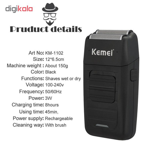 ماشین اصلاح کیمی مدل KM-1102 را میتوان یکی مقرون به صرفهترین و هوشمندانهترین انتخابها برای کسانی قلمداد کرد که به آراستگی ظاهر خود اهمیت میدهند. این ماشین اصلاح علیرغم بهرهمندی از تیغههایی از جنس استیل ضد زنگ با کیفیت و بدنهای از جنس پلاستیک مقاوم ABS قیمتی بسیار معقول دارد. انرژی مورد نیاز ماشین اصلاح سر و صورت کیمی مدل KM-1102 از طریق باتری داخلی آن تامین میشود. مدت زمان مورد نیاز برای شارژ این ماشین اصلاح 8 ساعت است و پس از شارژ کامل میتواند 45 دقیقه به صورت مداوم شارژدهی داشته باشد. روی بدنهی این ماشین اصلاح یک نشانگر LED برای آگاهی از اتصال آن به شارژر تعبیه شده است. ناگفته نماند که این ماشین عملکردی نزدیک به صفرزنی دارد و به طور کلی از ماشین اصلاح کیمی مدل KM-1102 میتوان از آن برای سایهزنی و خطزنی استفاده کرد.