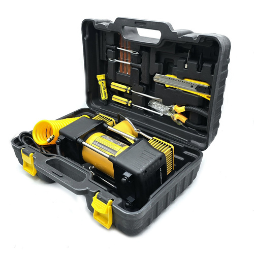 ✔ دارای متعلقات کاربردی؛ شلنگ فنری ، دمباریک، کاتر، انبرک های پنچر گیری، پیچ گوشتی دوسو و چهارسو، وصله پنچرگیری، چسب پنچرگیری، تبدیل فندکی به سر باتری خودرو، سه عدد سری (جهت باد زدن توپ، دوچرخه، قایق بادی و ...)