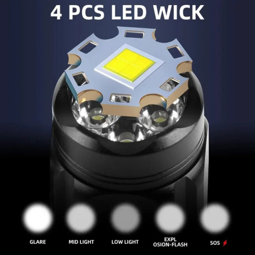 چهار عدد لامپ ال ای دی P35 با طول عمر 100.000 ساعت برای این چراغ قوه کاربردی استفاده شده که نور 15W را تا فاصله 100 متری برای شما به ارمغان میآورد. 5 حالت نوری مختلف دارد که با فشردن طولانی دکمه حالت های آن تغییر میکند. و دارای یک باتری یک اضافی میباشد.