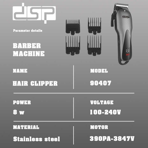 برای اصلاح مو در اندازههای مختلف،4 عدد شانهی اصلاح ( 3 تا 12 میلی متری) همراه دستگاه ارائه شده که روی تیغه قفل میشوند. این شانه ها روی تیغه های استیل ضدزنگ ماشین نصب میشوند و میتوان طول اصلاح را با استفاده از آن تغییر داد. همان طور که گفته شد انرژی ریشتراش از باتری لیتیومی قابلشارژ قدرتمند آن تأمین میشود. مدتزمان شارژ کامل باتری 3 ساعت و زمان شارژدهی آن نیز 240 دقیقه است و میزان شارژ باقی مانده برروی نمایشگر دستگاه قابل مشاهده است. داخل جعبه برس تمیزکننده و بطری روغن نیز قرار داده شده است که برای افزایش عمر تیغهها بهتر است پس از هر بار استفاده، خردههای مو را توسط برس تمیزو تیغه ها را توسط روغن مخصوص روغن کاری کنید . به طور خلاصه اقلام همراه ماشین اصلاح موی دی اس پی مدل 90407 شامل: 4 عدد شانه تنظیم کننده، آداپتور، برس تمیز کننده و روغن بوده و برای اصلاح موی صورت و بدن مناسب است.