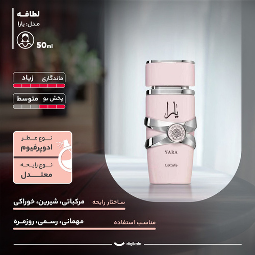 ادو پرفیوم زنانه لطافه مدل یارا با رایحه گرم و شیرین حجم 50 میلیلیتر